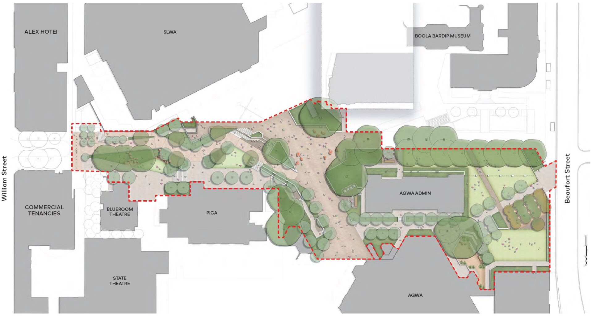 A network of shaded pathways, biodiverse plantings, and inviting gathering spaces enhances comfort, accessibility, and cultural expression. By integrating climate-responsive solutions—such as tree canopies, green corridors, and water-sensitive design—the precinct now fosters social interaction while mitigating urban heat. More than a redesign, this project is a bold step toward a sustainable and inclusive future, ensuring the Perth Cultural Centre is a place of connection, creativity, and community for generations to come.